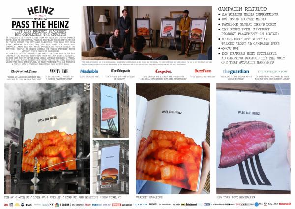 En la serie Mad Men, Don Draper presentó una propuesta de comercial para Heinz “Pass the Heinz”. A los ejecutivos ficticios no les gustó nada, pero en la vida real fue otra historia. En Heinz, sin relación alguna con la serie, decidieron contactarlos y pedirles permiso para usarlo en la vida real. Apareció en una valla publicitaria en Nueva York y en forma impresa en Variety y el New York Post. Don Draper, el publicista de ficción, aparece en los créditos del anuncio.