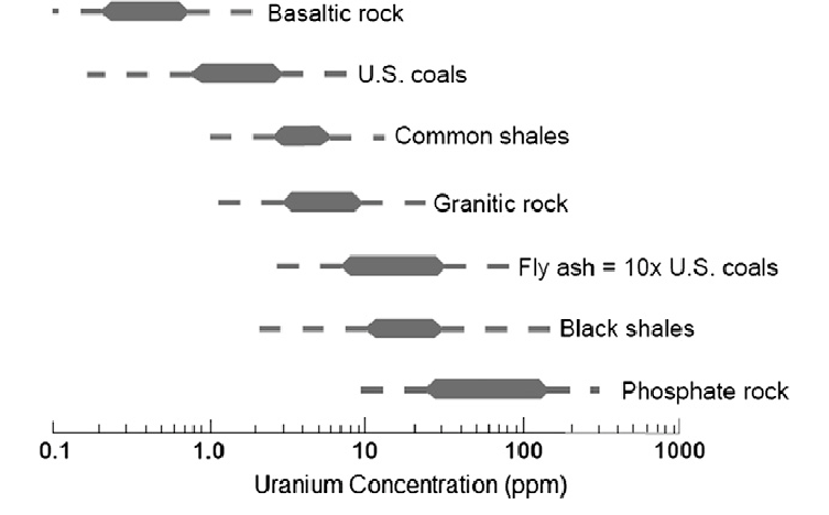 Rango típico de concentración de uranio en carbón, cenizas volantes y diversas rocas comunes.