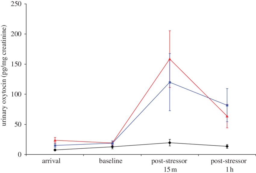 El habla materna libera oxitocina en las niñas, de forma muy similar a la interacción interpersonal directa, incluido el contacto físico reconfortante. Diamantes y línea negra: sin contacto; triángulos y línea roja: contacto directo; cuadrados y línea azul: solo habla.